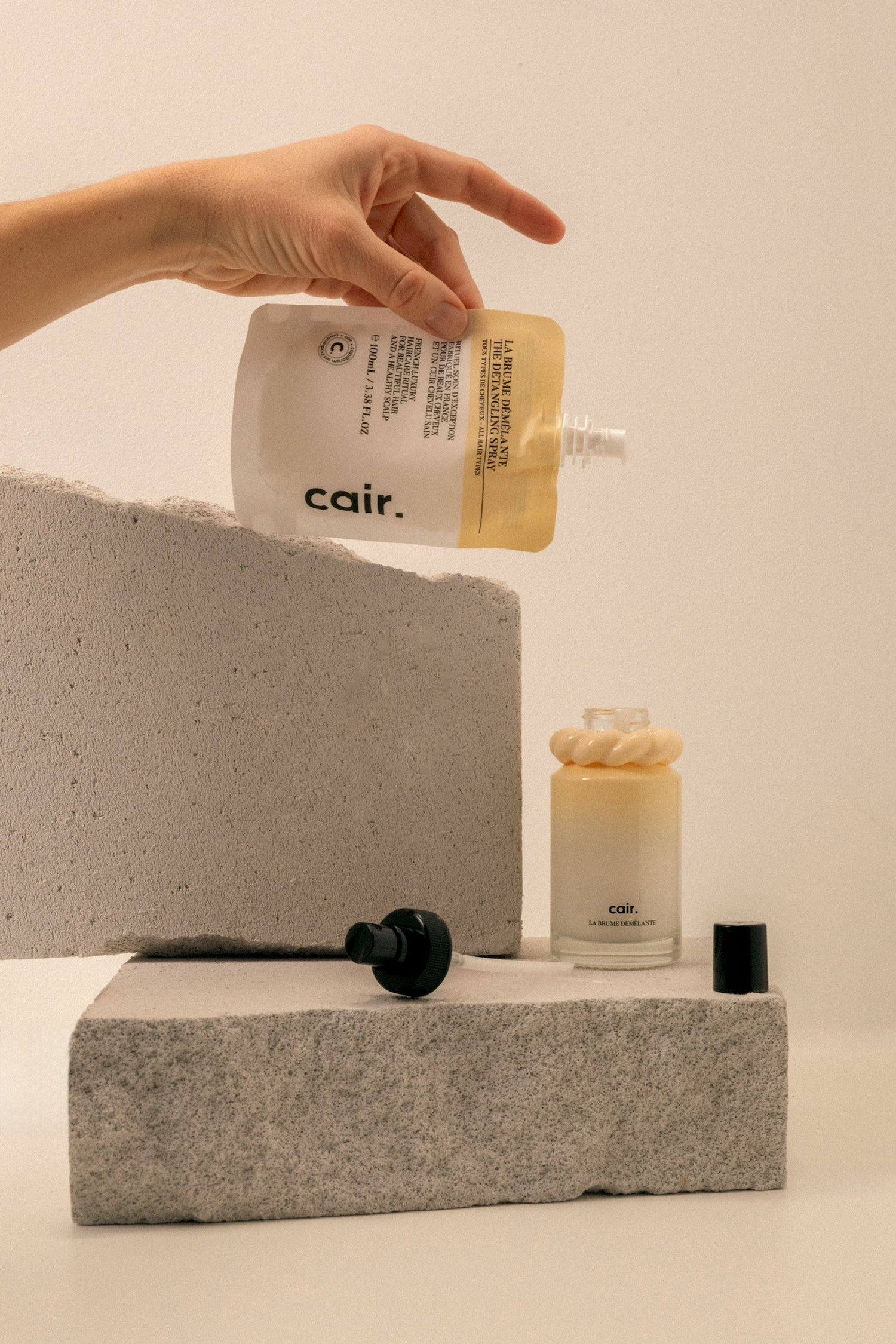 Perfectly adapted to the size of your Cair bottles, our refills are designed to help you refill your hair care bottles as soon as they are empty. With a capacity of 190ml for the sulfate- and silicone-free shampoo, and 100ml for the strengthening hair serum and detangling mist, our refills allow you to keep your glass bottles and reduce your plastic consumption.